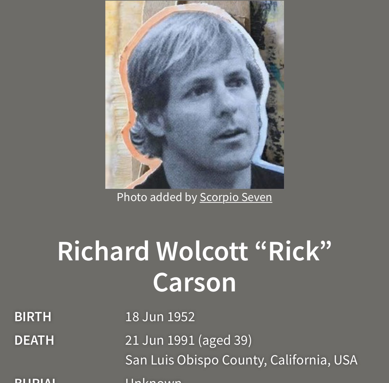 Jun 24, 1991 · richard wolcott carson, 39, of north hollywood was found dead friday a few feet from his car. Carson, who was not wearing a seatbelt, had been ejected from his 1991 nissan pathfinder after it. It has been reported that the fall killed him instantly and, according to the police that investigated the case, a camera tripod was found near the spot where rick lost his life. Jul 19, 1991 · richard wolcott carson, 39, died june 21 when his vehicle plunged down an embankment in cayucos. He had gone there to take pictures of the coast.first of all i want to thank all of you who were so very thoughtful, compassionate and sympathetic with your letters, carson said during wednesday's show.